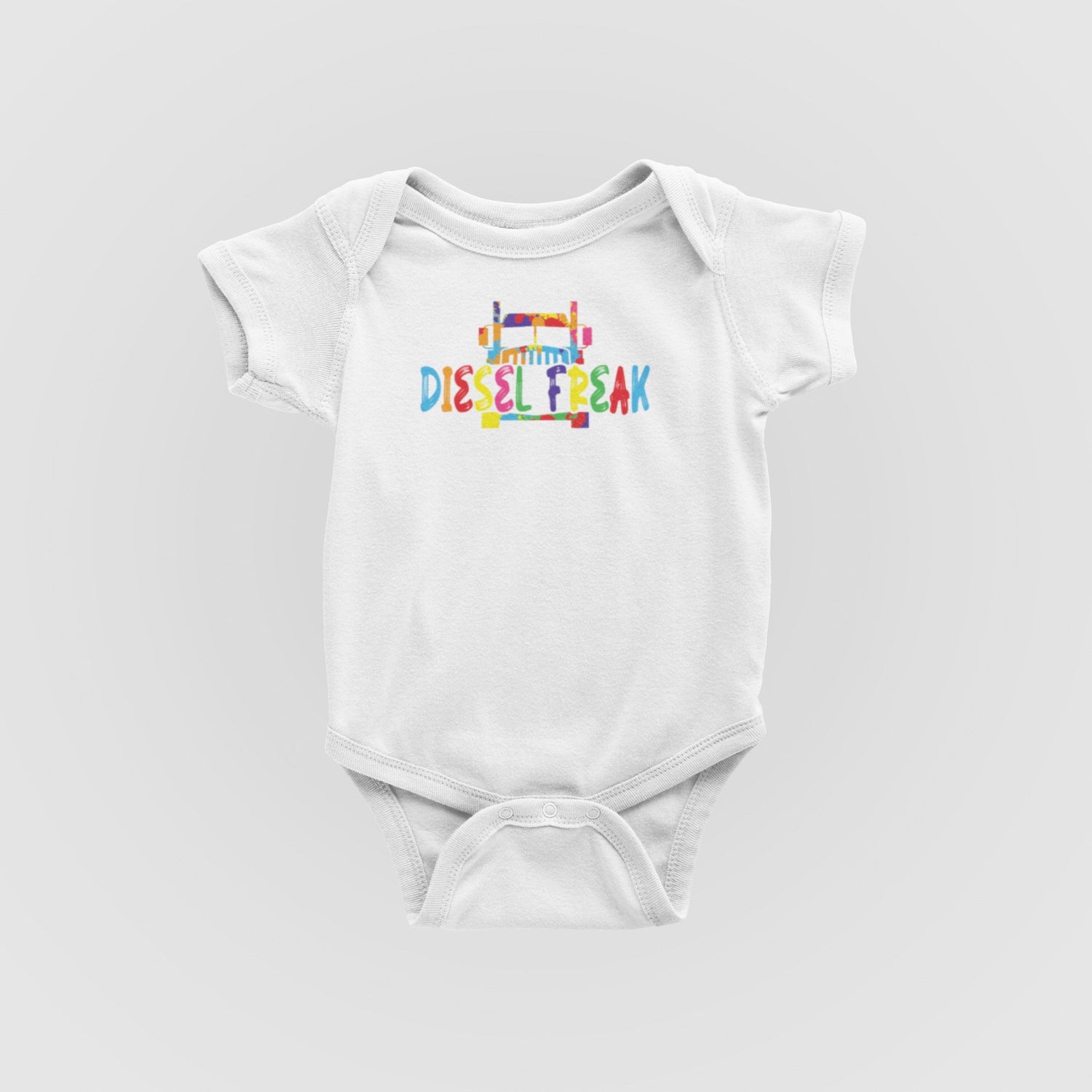 The white color of the bodysuit provides a clean and fresh backdrop, allowing the colorful rainbow splatter font to truly pop. The rainbow splatter effect adds a whimsical touch to the typography, creating a sense of fun and excitement. Within the splatter font, the words "Diesel Freak" proudly stand out, celebrating your little one's enthusiasm for all things powerful and extraordinary.