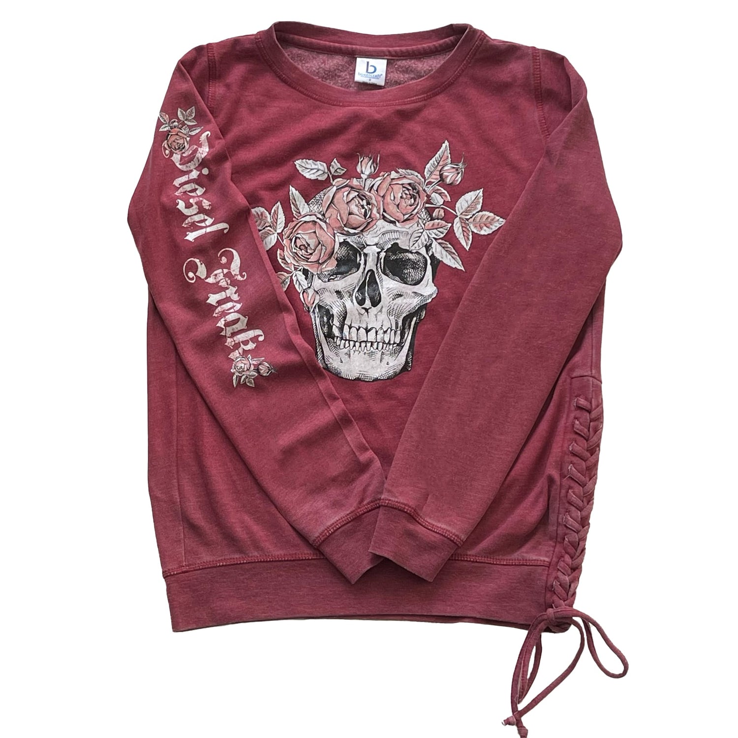 Diesel Freak sudadera con calavera y cabeza de flor granate - x-pequeño está agotado y se enviará tan pronto como vuelva a estar disponible.