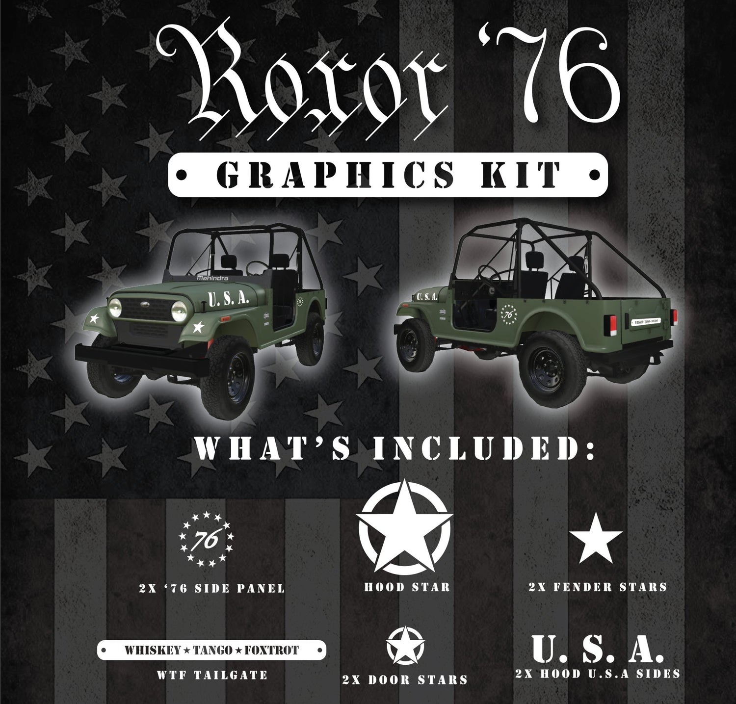 Transform your ride with the Roxor '76 Graphics Kit. With a bold military design, this kit includes high-quality decals that will make your vehicle stand out. Make a statement and add some adventure to your ride today!