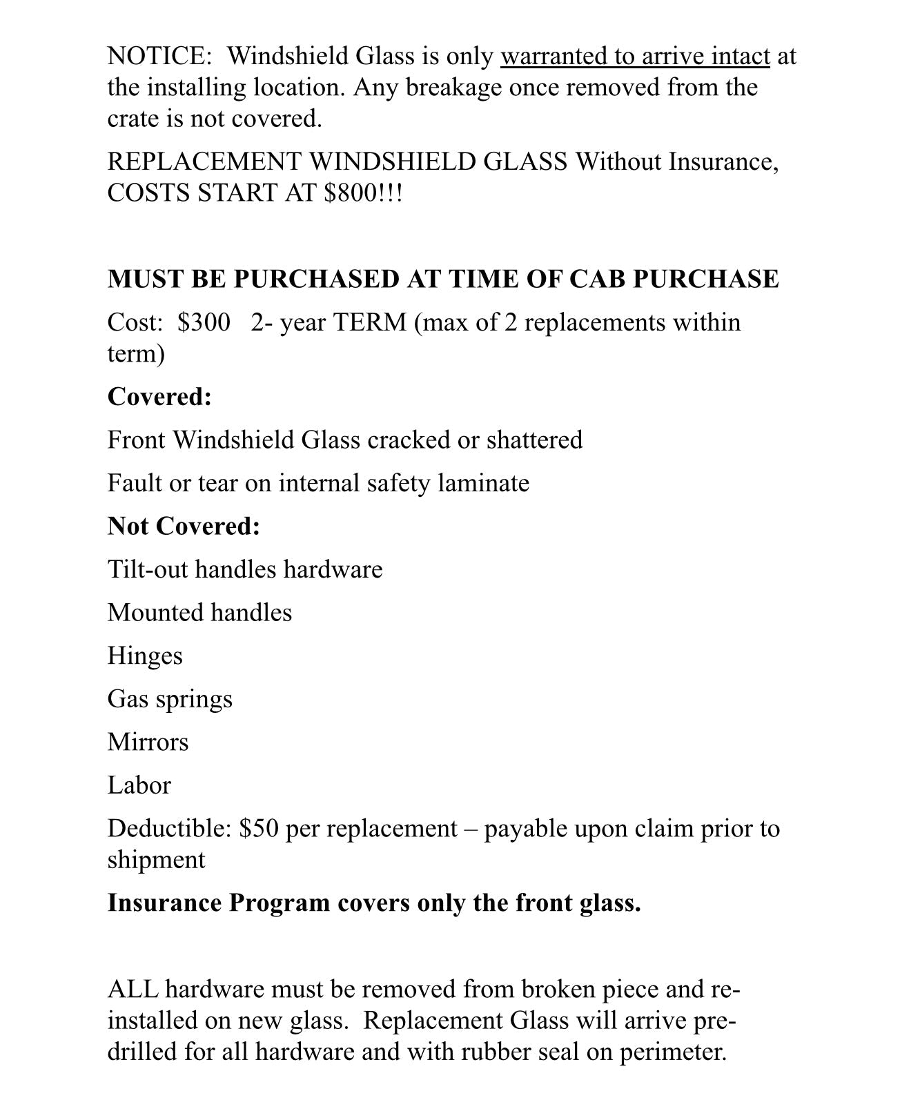 - Parabrisas de vidrio laminado de seguridad certificado por el DOT con función de inclinación asistida por resorte de gas que permite una posición de ventilación de 4” o una apertura total.